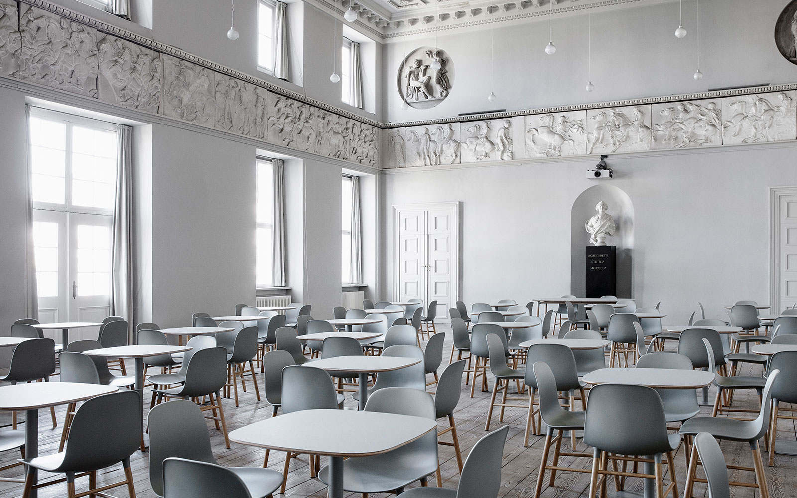 The cool Nordic color scale of the ballroom was emphasized by Form shell chairs in classic grey and natural oak legs. With its seamless, unified look, the Form series exudes a strong Scandinavian design aesthetic and high quality craftsmanship, worthy of any ballroom.