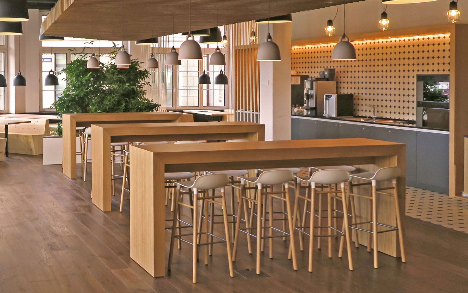 The new office areas now function as both break and relaxation areas, as well as alternative working and meeting spaces. Form barstools and round Slice tables offer ample space to sit together with colleagues during lunch hours, while also being conducive to a collaborative working environment.