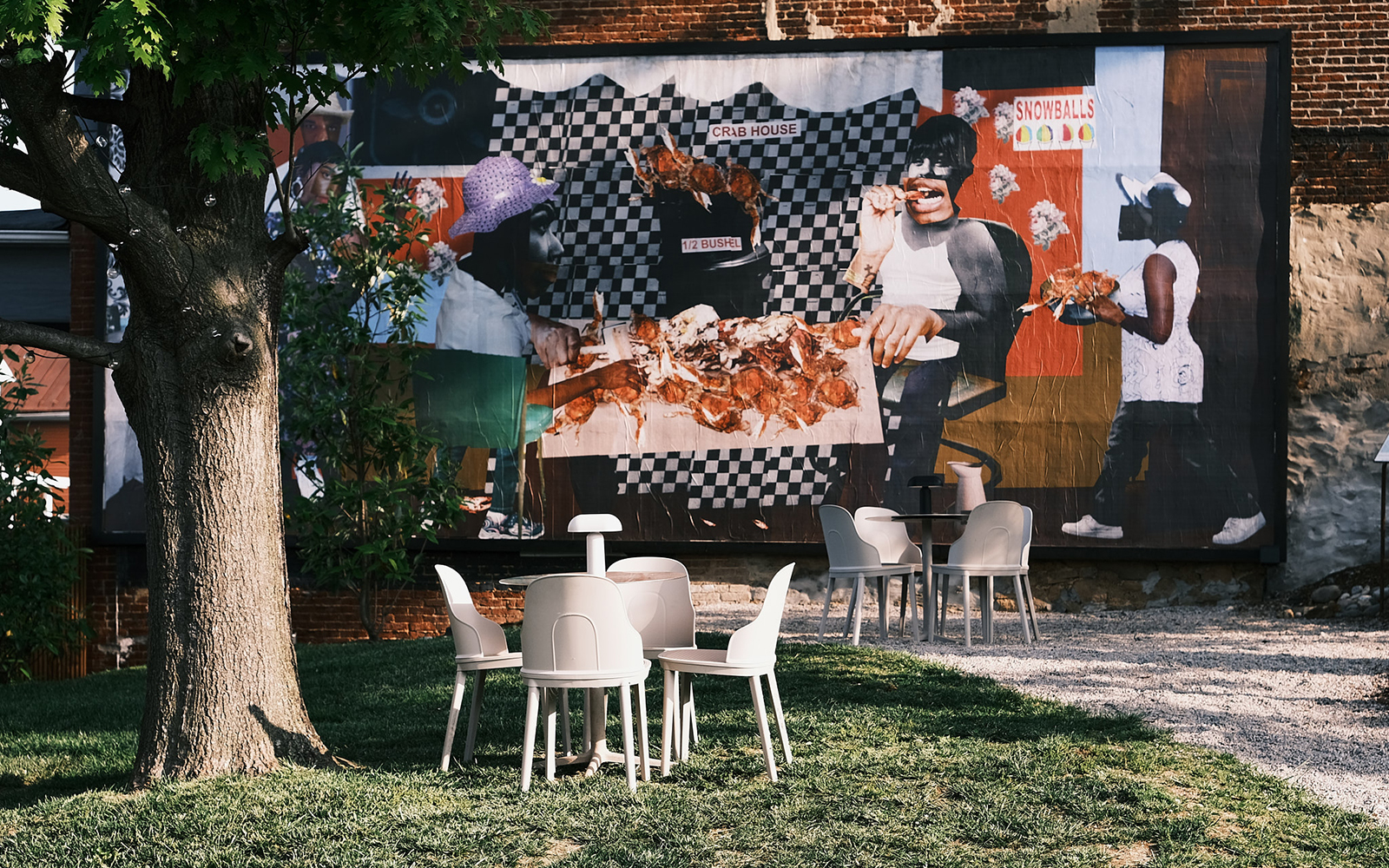 Titled Auntie Likes Her Rum and Extra Old Bay, and inspired by the Baltimore tradition of sitting down and enjoying crabs with family or friends, SHAN Wallace’s work is on view, free, and open to the public, in good neighbor’s outdoor space at 3827 Falls Road, Baltimore, MD.