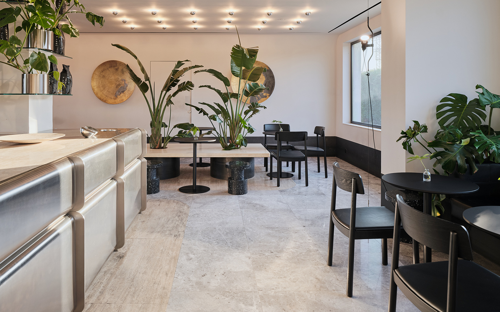 Enter Toby's Estate, a coffee shop in Messilah, Kuwait, where the interior design is inspired by the building's enveloping beige travertine, illuminating the original structure and showcasing its history. The space features the Timb Chair and Bit Stool from Normann Copenhagen.